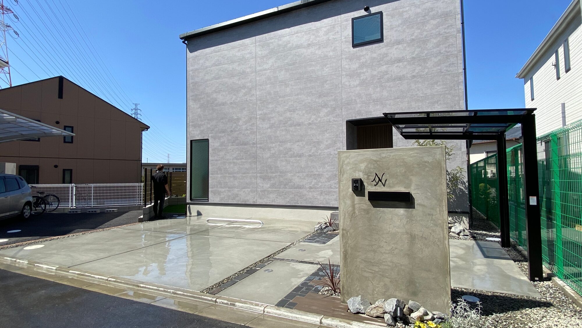 2つ目の事例では、グレーの外壁と木目の玄関ドアが印象的な建物に合わせて、外構のトーンを統一しています。