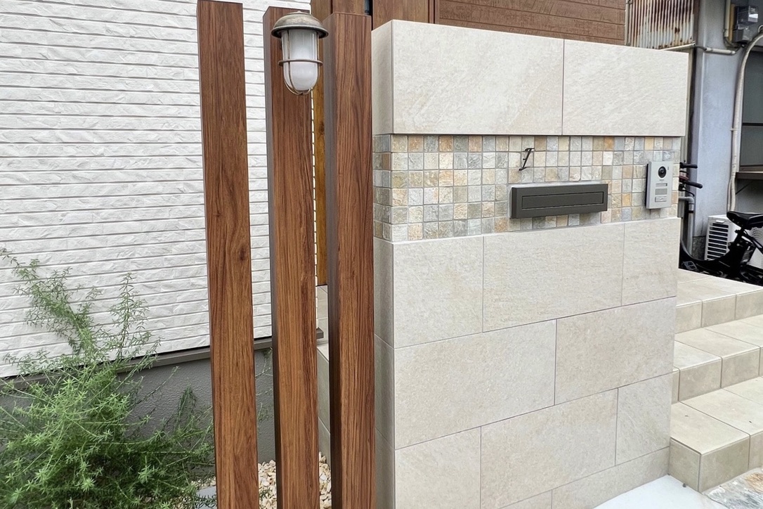 デザインの主役となる門柱には、やさしい色合いのモザイクタイルをアクセントとして採用。