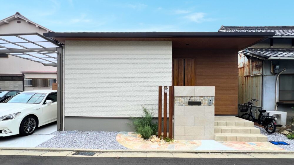 白を基調とし、木目とゴールドをアクセントにした外観。さまざまな植栽が目にとまる個性的な雰囲気に仕上がりました。