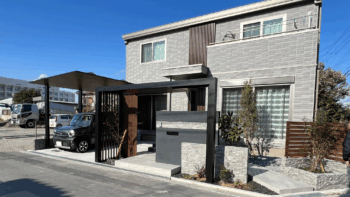 玄関前の目線対策として、塗装仕上げの門柱に枕木材を組み合わせ、柔らかい雰囲気のデザインに仕上げました。