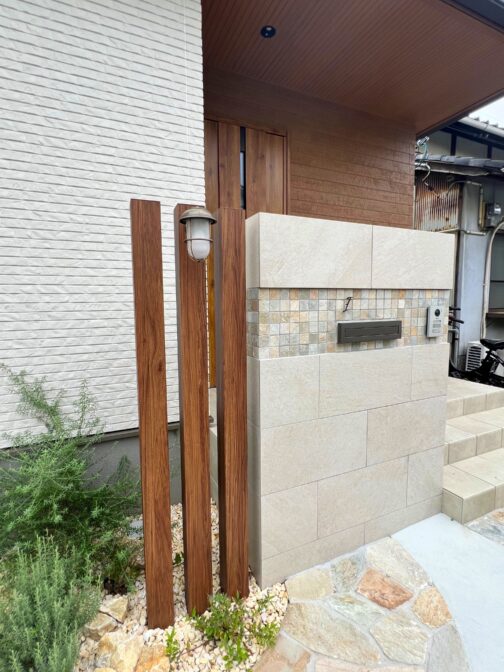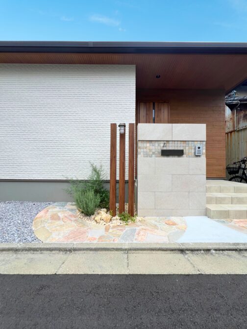 門柱には、表情豊かなモザイクタイルを採用し、ナチュラルで可愛らしい印象に仕上げました。足元にはアール(曲線)を描くように乱形石を配置することで、オープン外構でありながらも空間にリズムと奥行きを演出しています。
